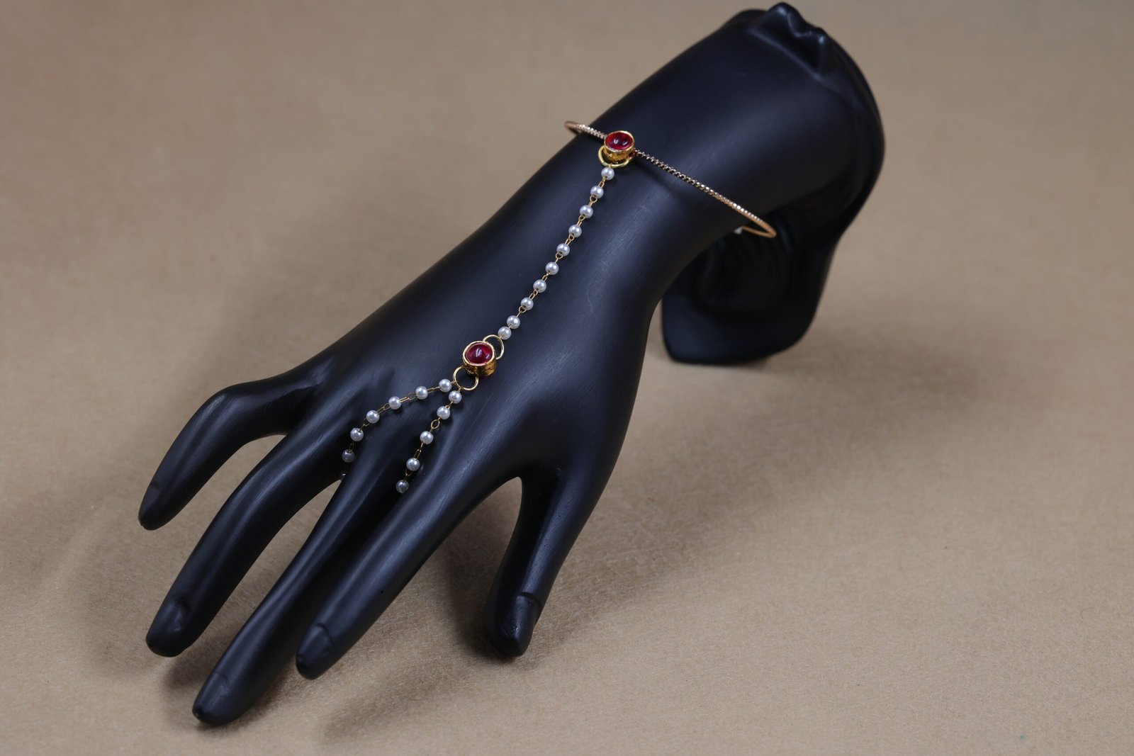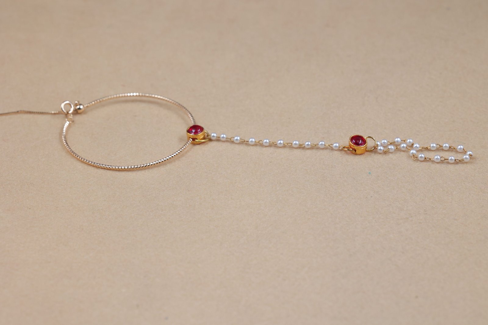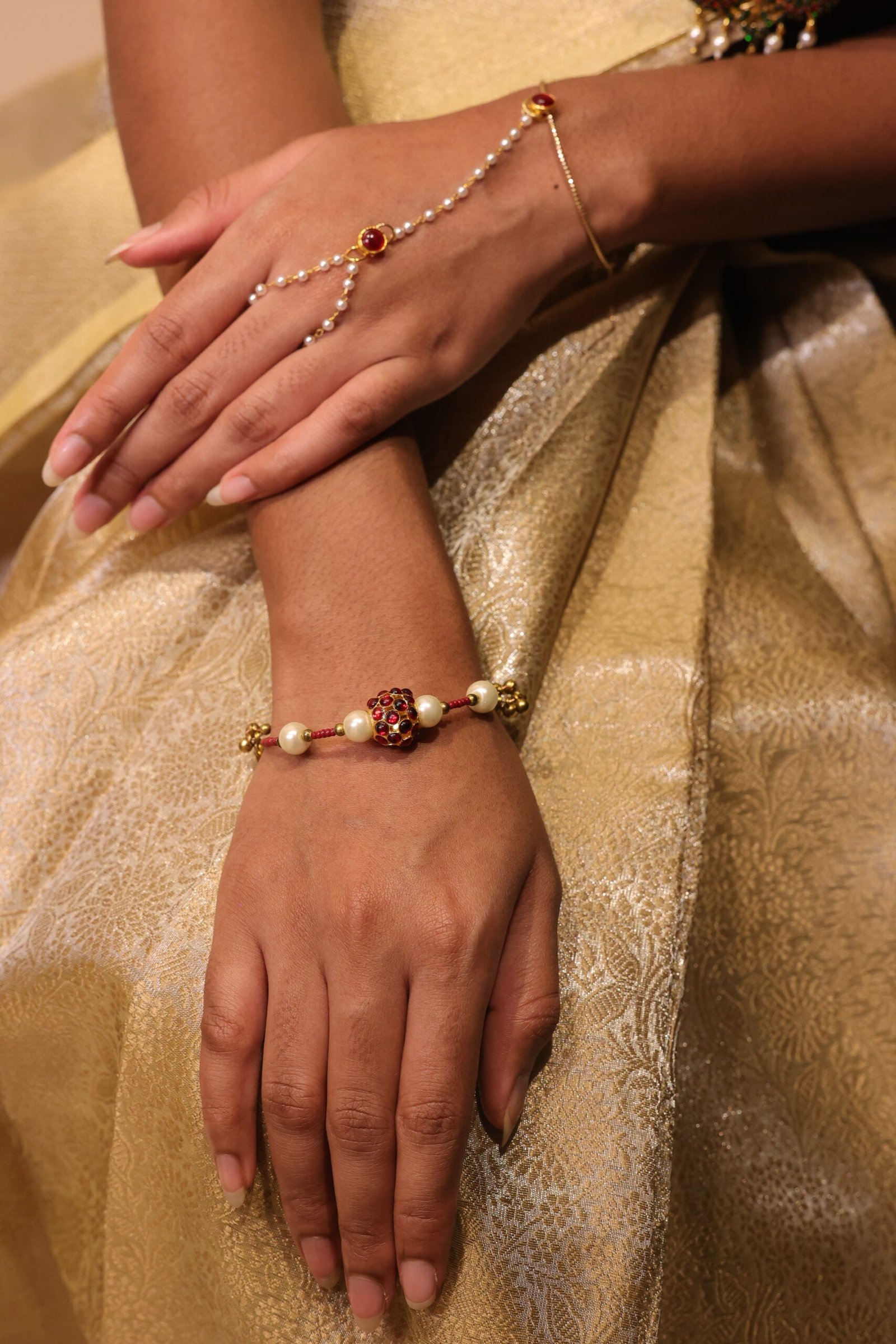 Introducing the hand chain bracelet with ring, a stunning piece of jewelry that effortlessly combines sophistication with modern flair. Perfect for special occasions, this unique accessory features a carefully crafted design that highlights the delicate beauty of pearls and the vibrant brilliance of the kemp connector. The adjustable bracelet ensures a comfortable fit, making it a versatile addition to your jewelry collection.